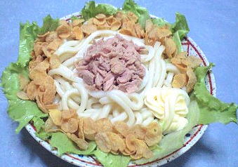 基本的に葉っぱ(レタスかキャベツ)とうどんとコーンフレークがあれば良いんですが、ツナ缶があったので投入。葉っぱはレタスのみ。